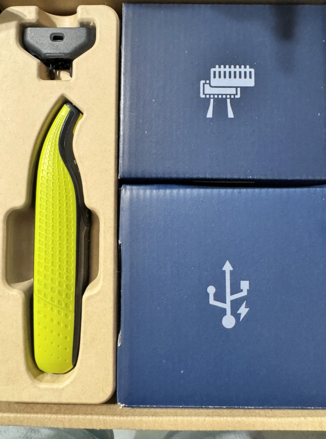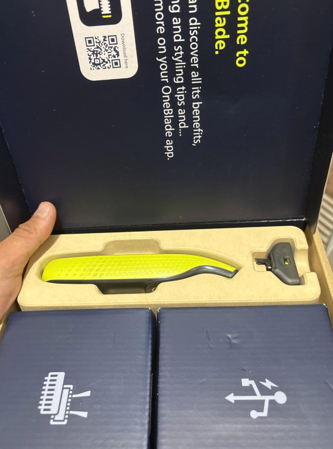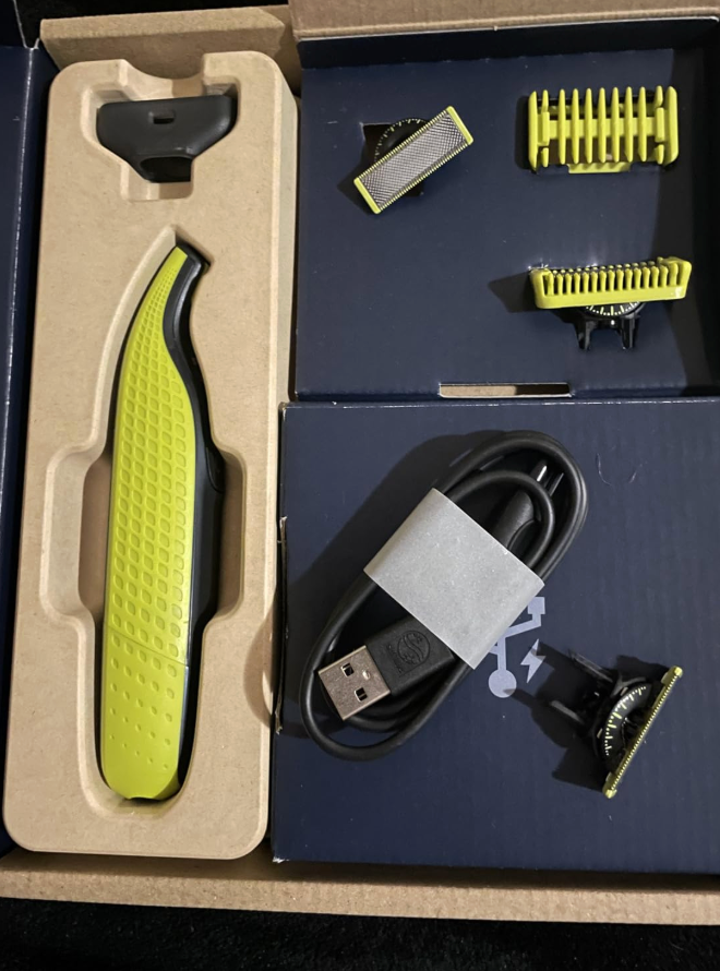 OneBlade-barbermaskinen, monteret klinge, oplader, beskyttelseshætte og manual. Ingen overraskelser og ingen skjulte omkostninger.